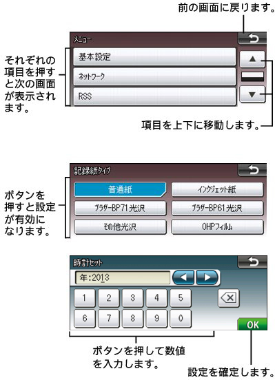 画面に表示された項目やボタンを指で軽く押して使用します。