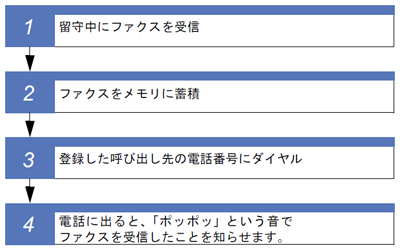 ファクスがメモリに蓄積されると、外出先の電話に知らせたり(電話呼び出し機能)、外出先のファクスへ転送(ファクス転送)することができます。