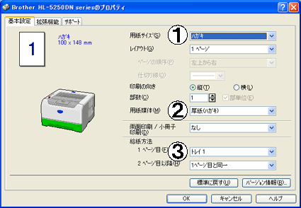 1. プリンタドライバで、用紙サイズ、用紙媒体および給紙方法などを設定します。
