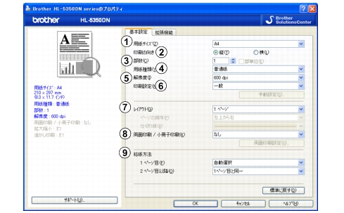 用紙サイズ、部数、用紙種類、解像度の設定項目は、プリンタドライバの設定画面左側のイラスト下に現在の設定が表示されます。また、レイアウトの設定は、イラストをクリックして変更することもできます。