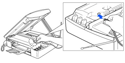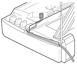 次に、本機の本体カバーを開け、インクカートリッジの隣にあるUSBケーブル接続端子にUSBケーブルを接続します。