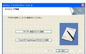 すぐにユーザー登録をする場合は[本ブラザー製品のオンライン登録]や[Presto!® PageManager® のオンライン登録]をクリックして、ユーザー登録を行います。登録終了後や、後でユーザー登録をする場合は手順11に進みます。