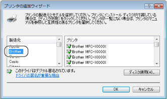 IPP印刷プロトコルのメリットの1つは、通信先のプリンタのモデル名が自動的に確定されることです。プリンタとの通信が確立すると、自動的にプリンタのモデル名が表示されるため、使用するプリンタドライバの種類をWindows Vista®、Windows Server® 2008に対して指定する必要はありません。 プリンタドライバがインストールされていない場合は、プリンタ追加ウィザードのプリンタ選択画面が表示されます。手順7に進んでください。 |