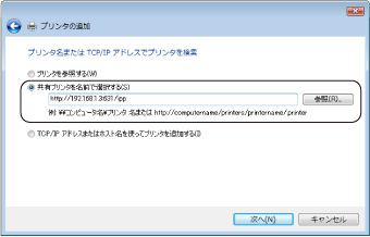 [共有プリンタを名前で解決する]をクリックし、ボックスに次のURLを入力する