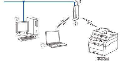 インフラストラクチャモードは、各無線LAN端末が無線LANアクセスポイント/ルーターを経由することによって、データ通信を行う通信方法です。本製品をインフラストラクチャモードに設定している場合は、すべての印刷ジョブを、無線LANアクセスポイント/ルーターを経由してから受け取ります。