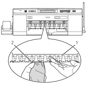 5. フラップ(1)を手前に持ち上げて排紙ローラー(2)のうら側を拭く