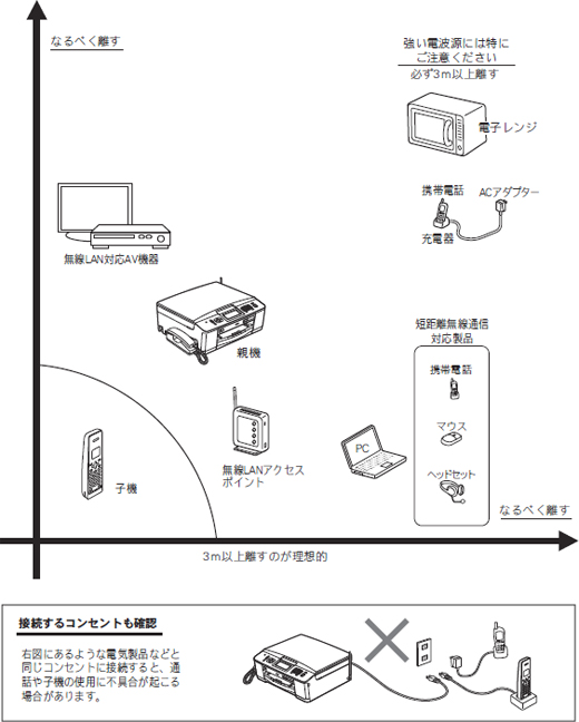 親機や子機の近くに微弱な電波を発する電気製品がある場合は、通話や子機の使用に影響を受けることがあります。通話状況が良くないときは、下図を参考に本製品の設置場所を調整してください。また、別冊の「安全にお使いいただくために」を必ずご確認ください。