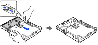 スライドトレイを使った印刷のあと、はがき、L判以外のサイズの記録紙に入れかえるときは、 リリースボタンをつまんで、スライドトレイをカチッと音がするまで完全に手前に引いておいてください。