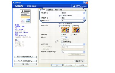 例:インクジェット紙のはがきに印刷する場合は、[用紙種類]を[インクジェット紙]、[用紙サイズ]を[ハガキ]に設定します。