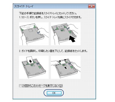 記録紙の偶数面がすべて印刷されたら、印刷された面を上向きにし、記録紙の下端が奥になるように、記録紙を用紙トレイにセットします。[OK]をクリックすると奇数面がすべて印刷されます。